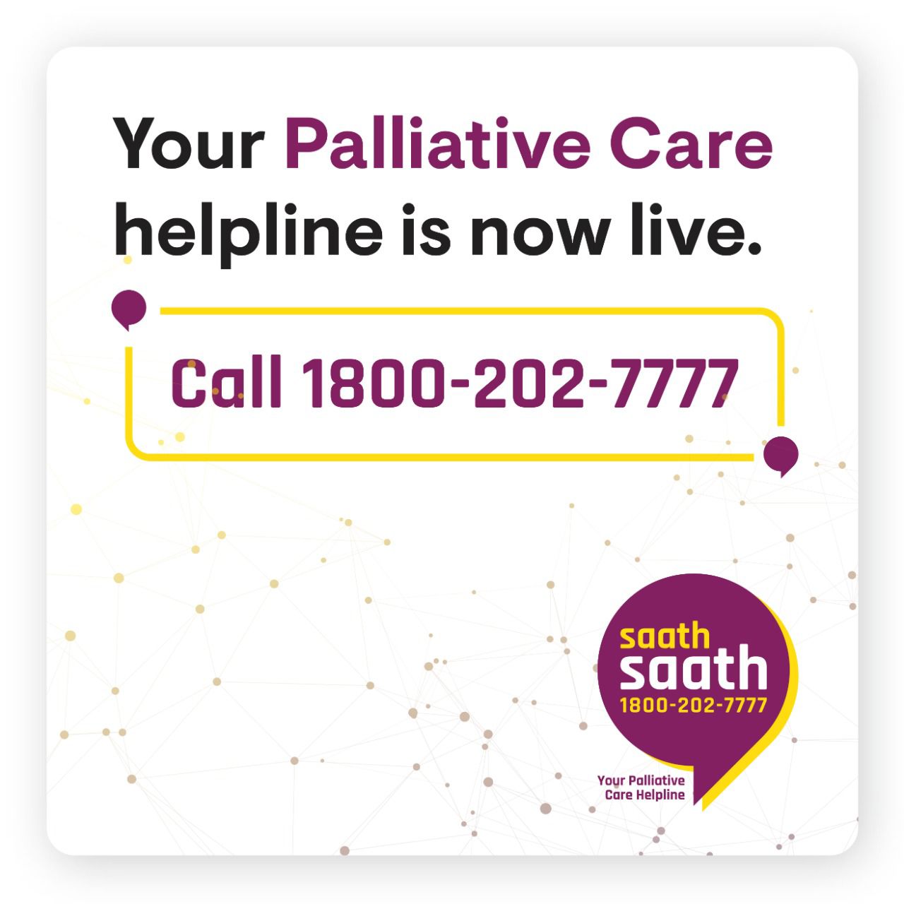 Saath-Saath Helpline: 1800-202-7777, is the first of its kind National, Free-of-cost Palliative care helpline. The helpline offers non-judgmental listening services to palliative patients and their caregivers, or to a patient’s physician, and connects them to the nearest palliative care center.