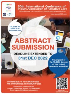 The organising committee of the 30th Annual International Conference of the Indian Association of Palliative Care (IAPCON 2023) have shared that the last date to submit abstracts for the conference has been extended to Saturday, 31st December, 2022.