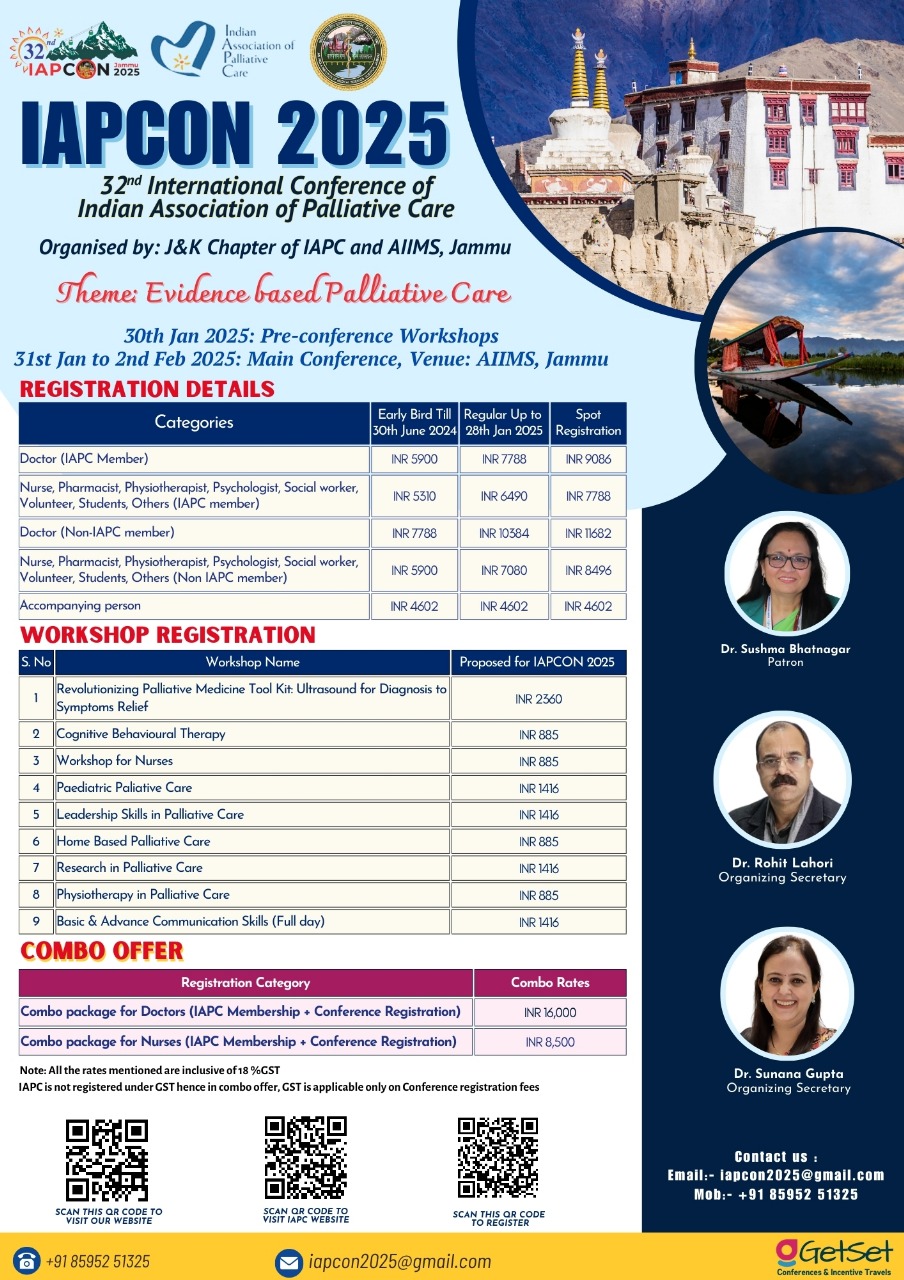 The theme of IAPCON 2025, the scientific fiesta, is ‘Evidence based Palliative Care’. The conference is scheduled to be held at the Auditorium of AIIMS Jammu, between Friday, 31st January, 2025, and Sunday, 2nd February, 2025, with pre-conference workshops being slated for Thursday, 30th January, 2025.