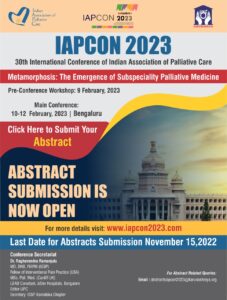 The organizing team of the 30th Annual International Conference of the Indian Association of Palliative Care (IAPCON 2023), invites abstracts for oral and poster presentations with the theme ‘Metamorphosis: the emergence of subspeciality palliative medicine’.