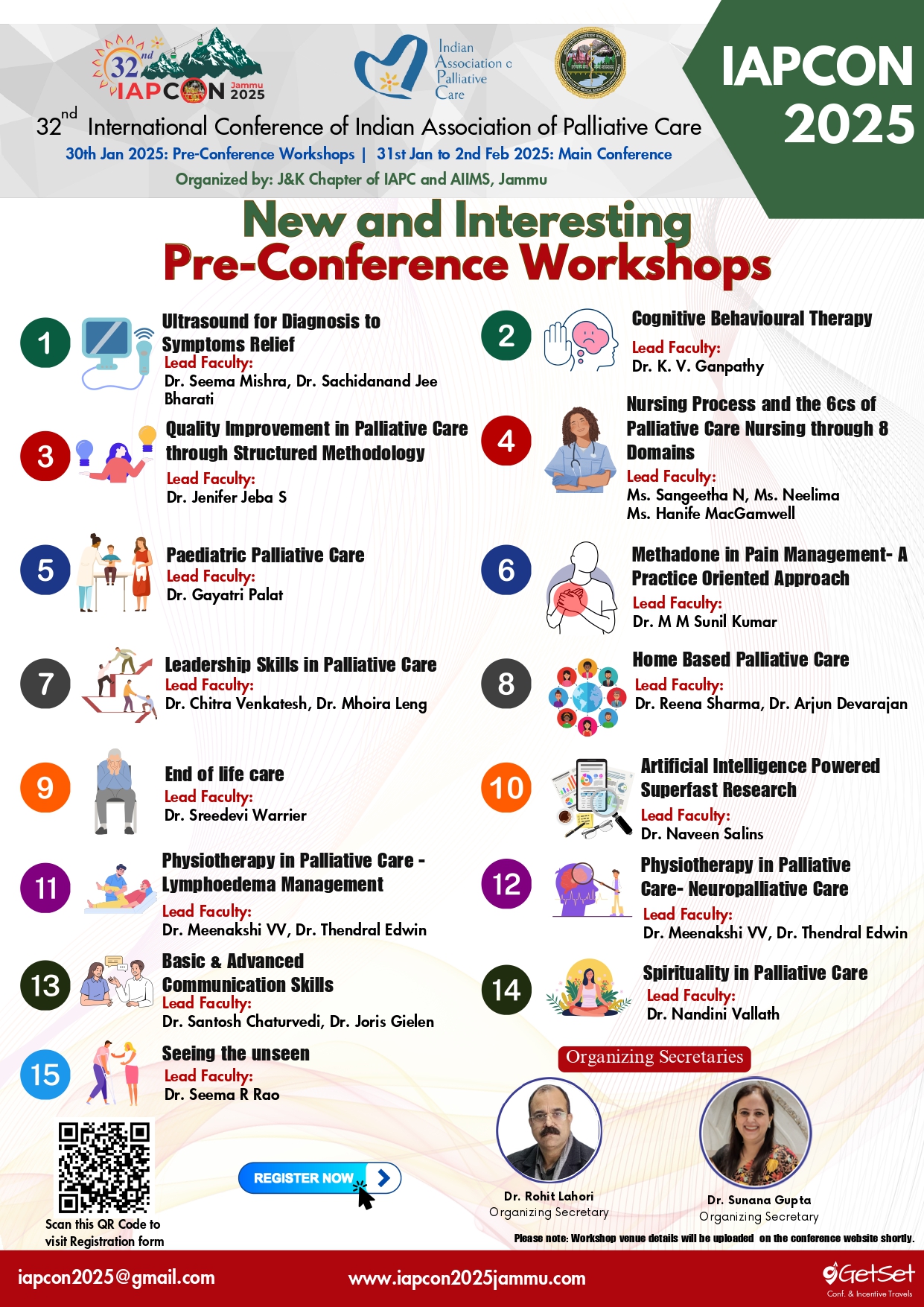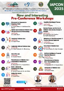 The Scientific Committee of IAPCON 2025, led by Dr Anjum Joad, shares enthusiastically that this year there are 15 very exciting and innovative pre conference workshops, some of which are being organised for the first time at IAPCON. The interesting line up of pre-conference workshops are being led by expert palliative care professionals from across the country and is scheduled to be held on Thursday, 30th January, 2025. For further details regarding the pre conference workshops, please click here.