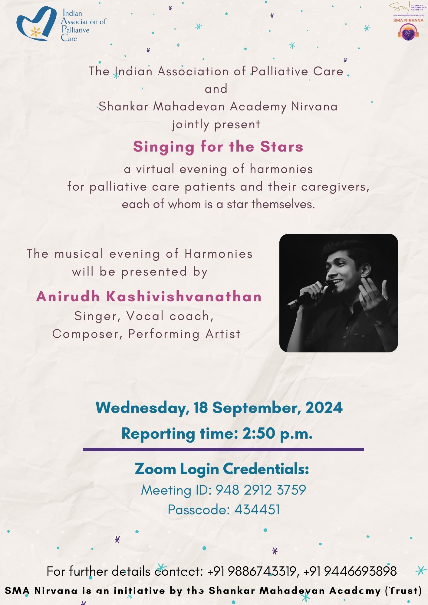 The palliative care community was treated to a pleasant surprise as the Artist for the program, Mr Anirudh Kashivishvanathan (Singer, Vocal Coach, Composer, and Performing Artist) joined us with his band ‘Chutney’. To everyone’s dismay and with sincere regret, we share that the program did not proceed as planned due to sudden unforeseen technical glitches.