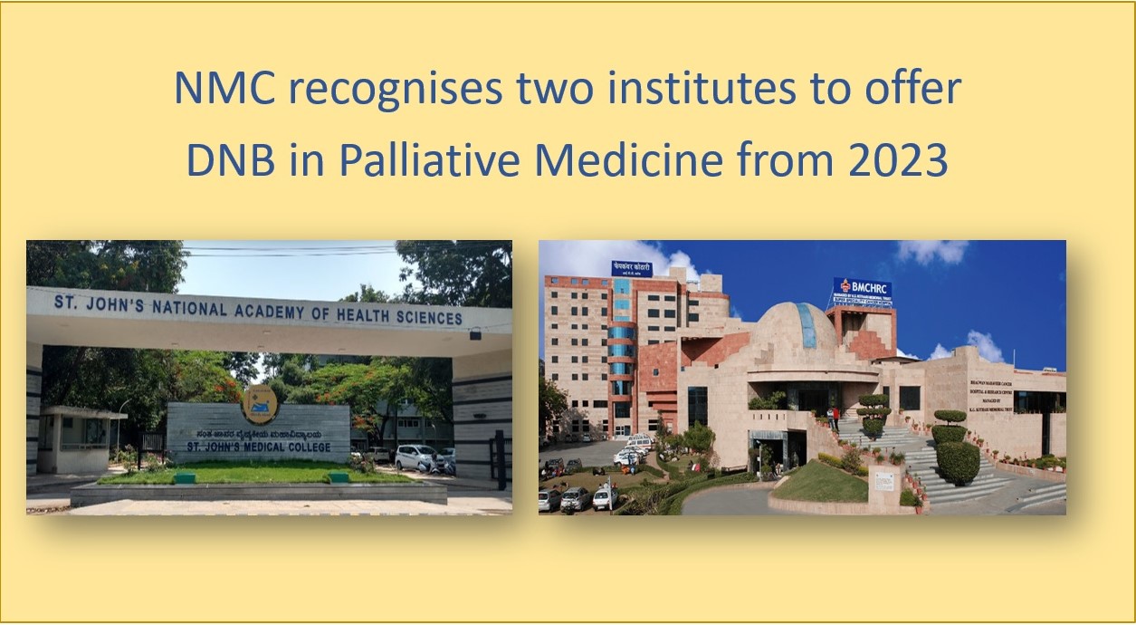We are thrilled to announce that the St John’s National Academy of Health Sciences, Bengaluru, Karnataka, and the Bhagwan Mahaveer Cancer Hospital and Research Centre, Jaipur, Rajasthan, have been recently approved by the National Medical Commission (NMC) to begin offering DNB in Palliative Medicine from this academic year.