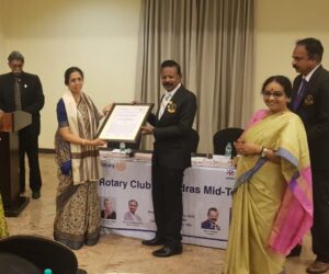 The award was presented to Dr Kalpana Balakrishnan by Rtn V Karthik (President, Rotary Club of Madras Mid Town) in the presence of Rtn Krishna Routhu (Director – Vocational Services, Rotary Club of Madras Mid Town) and Rtn Kamal Narendra (Secretary, Rotary Club of Madras Mid Town).