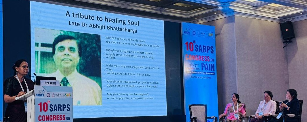 Dr. Sushma Bhatnagar (Past President, IAPC & Former Chief, DR BRAIRCH, AIIMS, New Delhi, Clinical Lead, Palliative Medicine, Indraprastha Apollo Hospital, New Delhi) delivered the prestigious Dr. Abhijeet Bhattacharya Memorial Oration at the 10th SARPS Congress on Pain, held in New Delhi on 26–27 September. Her oration, titled Pain Management in India: A Paradigm Shift, highlighted the remarkable progress and evolving landscape of pain care in the country.