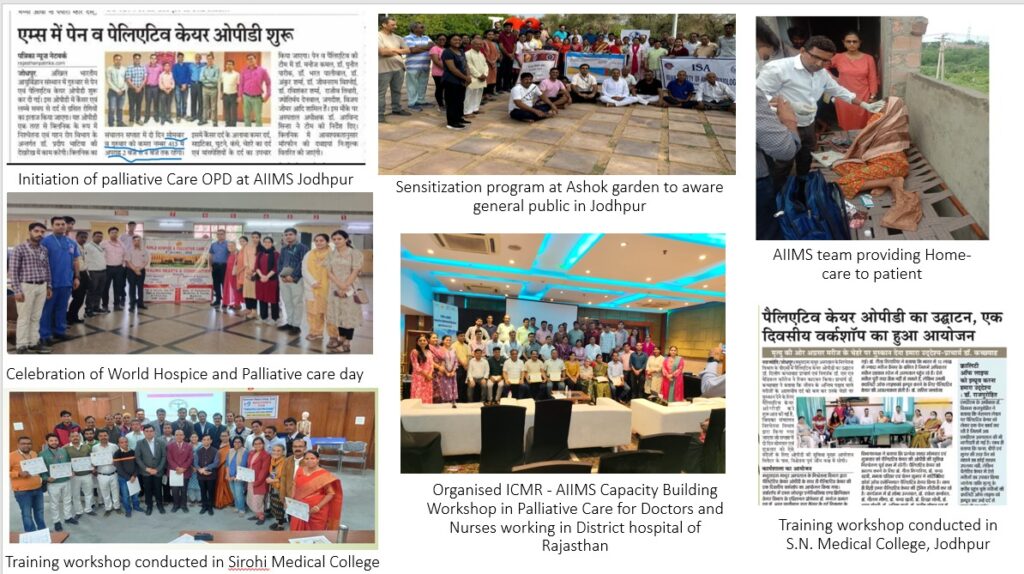 Education and Training – AIIMS Jodhpur became a nodal centre for the Indian Association of Palliative Care’s (IAPC) Certificate Course in Essentials of Palliative Care (CCEPC). Over 300 participants have completed Part 1, and more than 60 have completed Part 2. AIIMS also trains ASHA / ANMs under ICMR funding to provide basic palliative care at the community level.