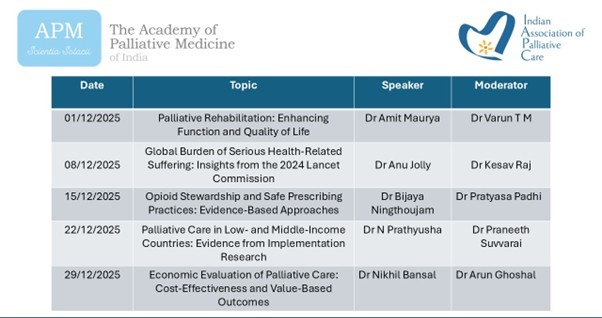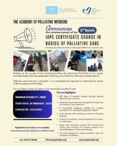 The Academy of Palliative Medicine announces the commencement of the 3rd Batch of the IAPC Certificate Course in Basics of Palliative Care, beginning on 28 February 2026. Building on the success of previous cohorts, this six-month blended program offers deeper learning, dedicated mentoring, and interactive, discussion-based sessions aimed at strengthening foundational competencies in palliative care. The course combines thoughtfully designed online modules with live mentor-led sessions and a mandatory clinical attachment to ensure hands-on experience and professional readiness.