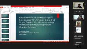 The first session from the December series was an excellent presentation on ‘Paediatric Neurological Conditions needing Palliative Care’, delivered by Dr Rutula Sonawane. Dr Manisha went on to deliver a fantastic presentation on ‘Multiple Sclerosis’, which was the last session of Section B (Palliative Medicine in Neurology– Review of Evidence) from Series 3. Next, Dr Kunal Ranjan Vinayak’s interesting session on ‘Palliative Care in Heart Failure including Needs Assessment and Advance Care Planning’, was the first session to be delivered from Section C (Palliative Medicine in Cardiology – Review of Evidence) of the Lecture Series 3. Dr Avinash Tiwari’s comprehensive and informative session on ‘Rationalisation of pharmacological management in Advanced and End Stage Cardiac Conditions including withholding/withdrawing various cardiac devices’ was the last session to be delivered in the December series.