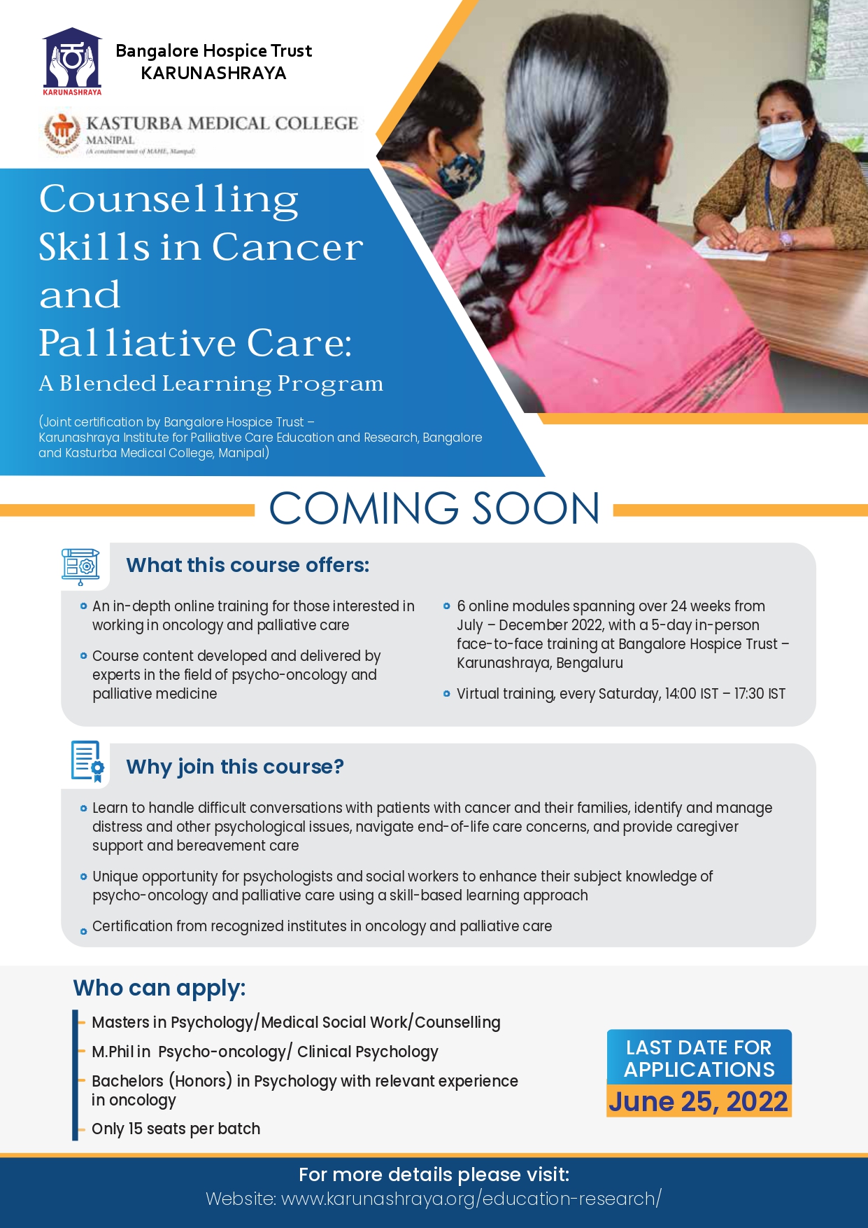 Registrations are now open for the Counselling Skills in Cancer and Palliative Care: A Blended Learning Programoffered jointly by the Bangalore Hospice Trust – Karunashraya Institute for Palliative Care Education and Research (KIPCER), Bengaluru and Kasturba Medical College (KMC), Manipal.