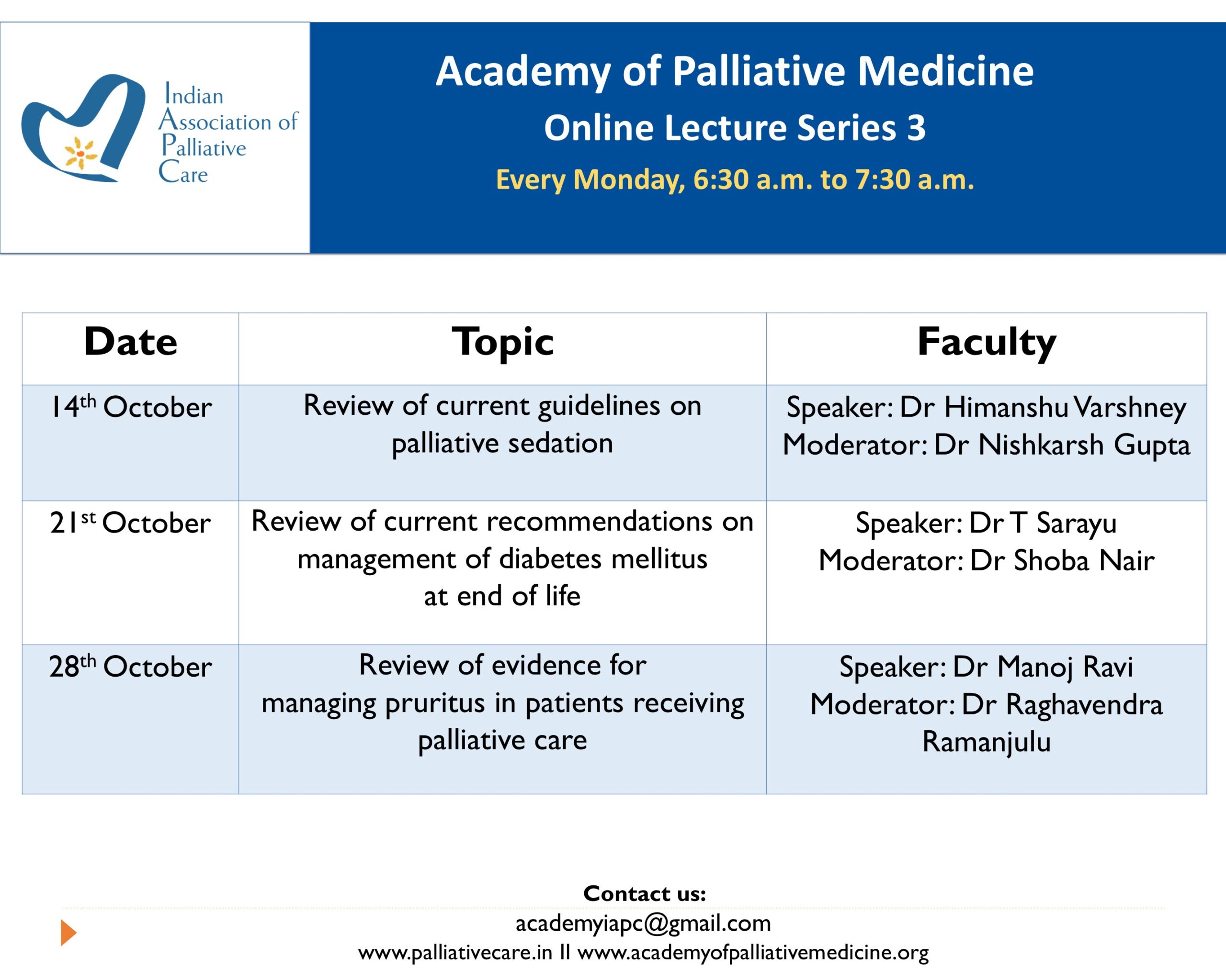 We are excited to announce that the ‘Academy of Palliative Medicine’s online Lecture Series 3’ will begin from Monday, 14th October, 2024, at 6:30 a.m.