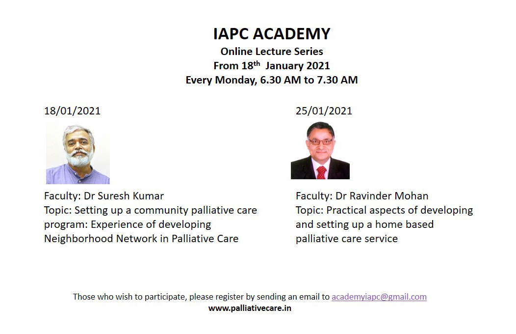 The Part 2 of the IAPC Academy Lecture Series will begin with a talk by the eminent faculty and a pioneer in the field of Palliative Care in India, Dr. Suresh Kumar, Director WHO CC for Community Participation in Palliative Care and Long Term Care, Institute of Palliative Medicine, Kozhikode, India. He took a significant role in developing the globally acclaimed Community Owned Palliative Care Services in Kerala which is also known as Neighborhood Network in Palliative Care (NNPC). Dr. Suresh Kumar will be sharing his experience of setting up Community Palliative Care Services in his lecture on 18th January, from 6:30 AM to 7:30 AM.