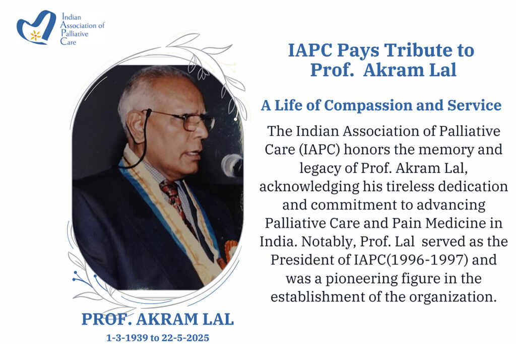 The Indian Association of Palliative Care (IAPC) deeply mourns the passing of Prof. Akram Lal, a pioneer in Palliative Care and Pain Medicine in India.
