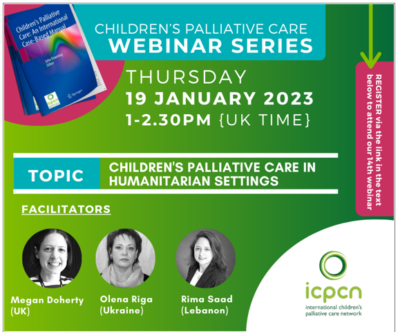 The next webinar in the series, ‘Children’s Palliative Care in Humanitarian Settings’ aims to explore issues around providing children’s palliative care in humanitarian settings, and is scheduled to be held between 6:30 p.m. and 8:00 p.m. on Thursday, 19th January, 2023.