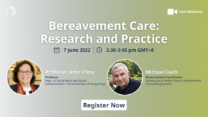 The webinar will be delivered by Amy Y. M. Chow, Professor with the Department of Social Work and Social Administration, The University of Hong Kong; and Michael Dash, Coordinator of the Sydney Local Health District Palliative Care Bereavement Counselling Service.