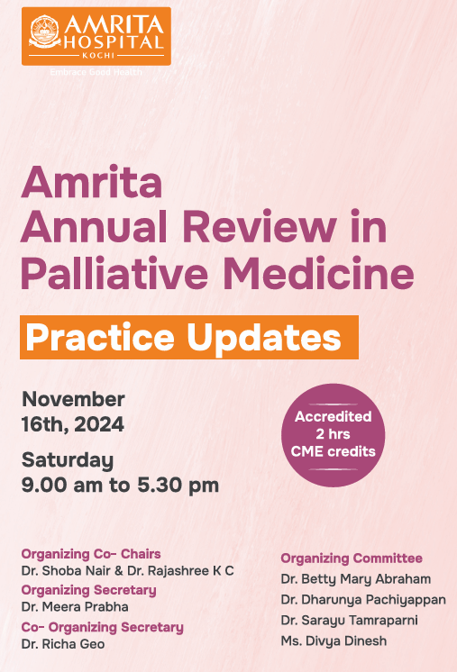 According to the organizers, “As we enter the third year of our postgraduate training in Palliative Medicine, it is an opportune time to conduct our first academic program focusing on recent updates that will influence the practice of palliative medicine in the country.” They invite the medical fraternity to join them in this academic feast, where knowledge will be exchanged and doctors will be empowered to practice evidence-based medicine in the field of palliative medicine. In Kerala, Amrita Institute of Medical Sciences started the first MD program in Palliative Medicine, in 2022.