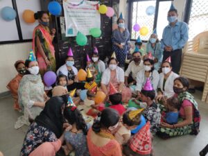 - Celebrations at CSMH, Kalwa, was organized in a hybrid manner with children staying in near proximity to the center joining the celebrations physically while the rest of the children joining in virtually. Children and their siblings were encouraged to make hats at their homes, prior to the celebrations, and send in photos and videos from this activity along with other videos of them singing, dancing etc. We were overwhelmed to note that despite their sufferings, the enthusiastic children sent in their videos sufficiently in advance, which allowed us to broadcast them during the program.